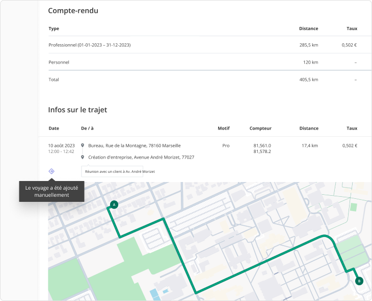 Le suivi automatique garantit la précision des carnets de bord. Pour simplifier l’examen des demandes et éviter toute majoration, les trajets ajoutés manuellement sont mis en évidence et reportés sur une carte.